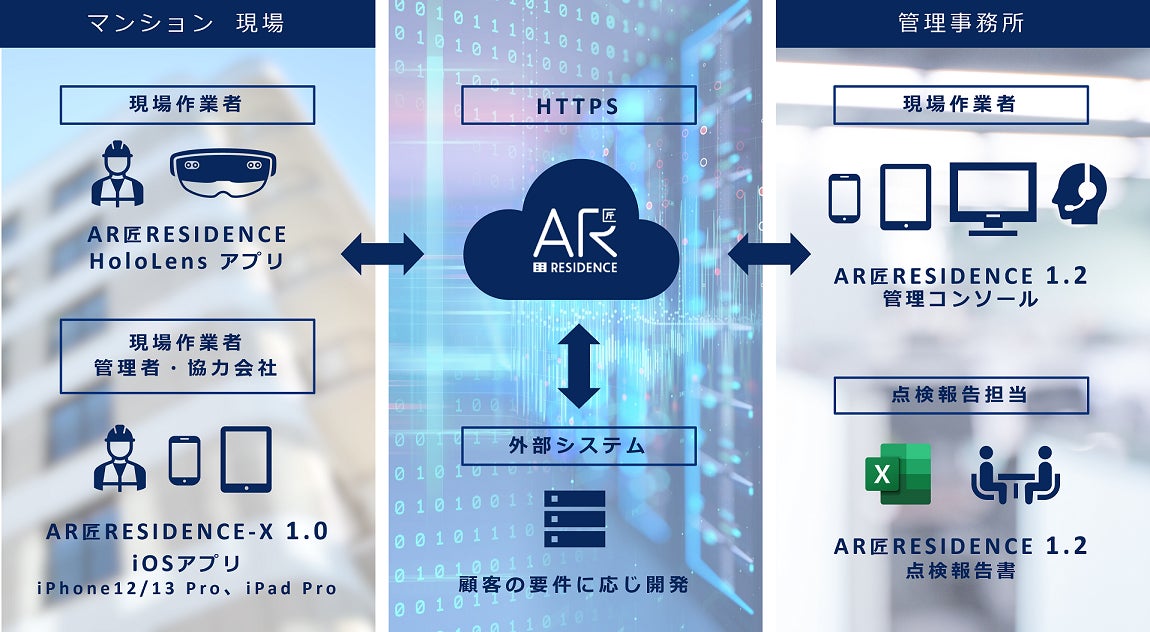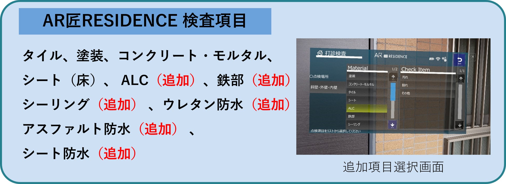 株式会社 長谷工コーポレーション(本社:東京都港区、代表取締役社長:池上 一夫、以下 長谷工コーポレーション)と株式会社アウトソーシングテクノロジー(本社:東京都千代田区、代表取締役社長:鈴木 一彦、以下アウトソーシングテクノロジー)は、共同開発したマンション打診検査のMRソリューション「AR匠RESIDENCE」の新バージョン1.2(特許出願中)を2022年10月21日にリリースいたしました。新バージョンでは、外壁タイルの打診検査と併せて他の外装部分の検査ができるように、シーリングや防水などの検査項目を追加しています。その他、報告書作成の改善や建物の状態をデジタルで管理できるようにMR空間で検査結果の経過を確認することが可能となっています。株式会社長谷工リフォーム(本社:東京都港区、代表取締役社長:河合 英樹、以下 長谷工リフォーム)では新バージョンを活用して建物診断を実施しており、本追加機能により充実させたサービスを展開しています。また、導入のしやすさや適用範囲の拡大を目的にiOS版アプリを共同開発し実証を行いました。今後、HoloLensとiOSデバイスを併用した作業の最適化をご提案するとともに、デジタル化が進む建設・不動産業界における幅広いニーズに応えてまいります。