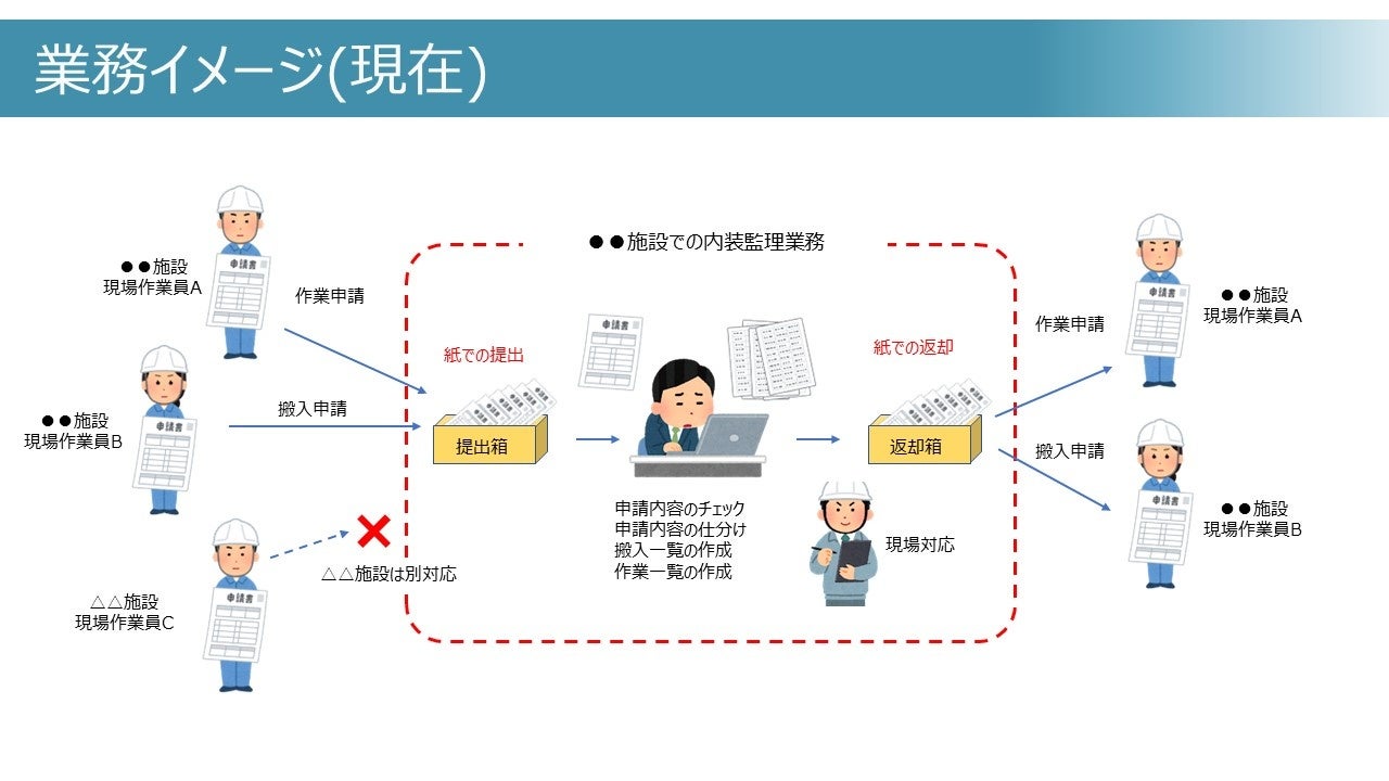 建設現場では申請に関わる書類が多く、工事関係者は大量に紙を持ち歩き、それを管理する内装監理業務では大量の紙を整理しています。これらが非効率の原因となり、現場作業員に負担がかかり、紙書類の申請から管理まで一連の運用に労力と時間を費やしていました。