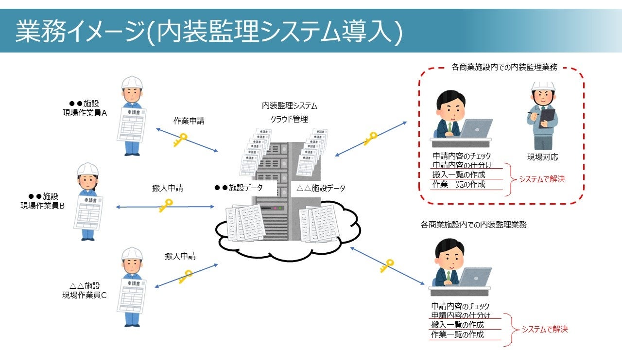 本システムは、建設現場における作業届や搬入届など、これまで紙で行われてきた各種申請をデジタル化するものです。申請内容はクラウド上で一元的に管理されるため、関係者間で円滑に情報共有できるようになります。これら内装監理業務のデジタル化で、生産性向上と工事関係者らの作業負担軽減、ペーパーレス化による環境負荷低減を実現します。