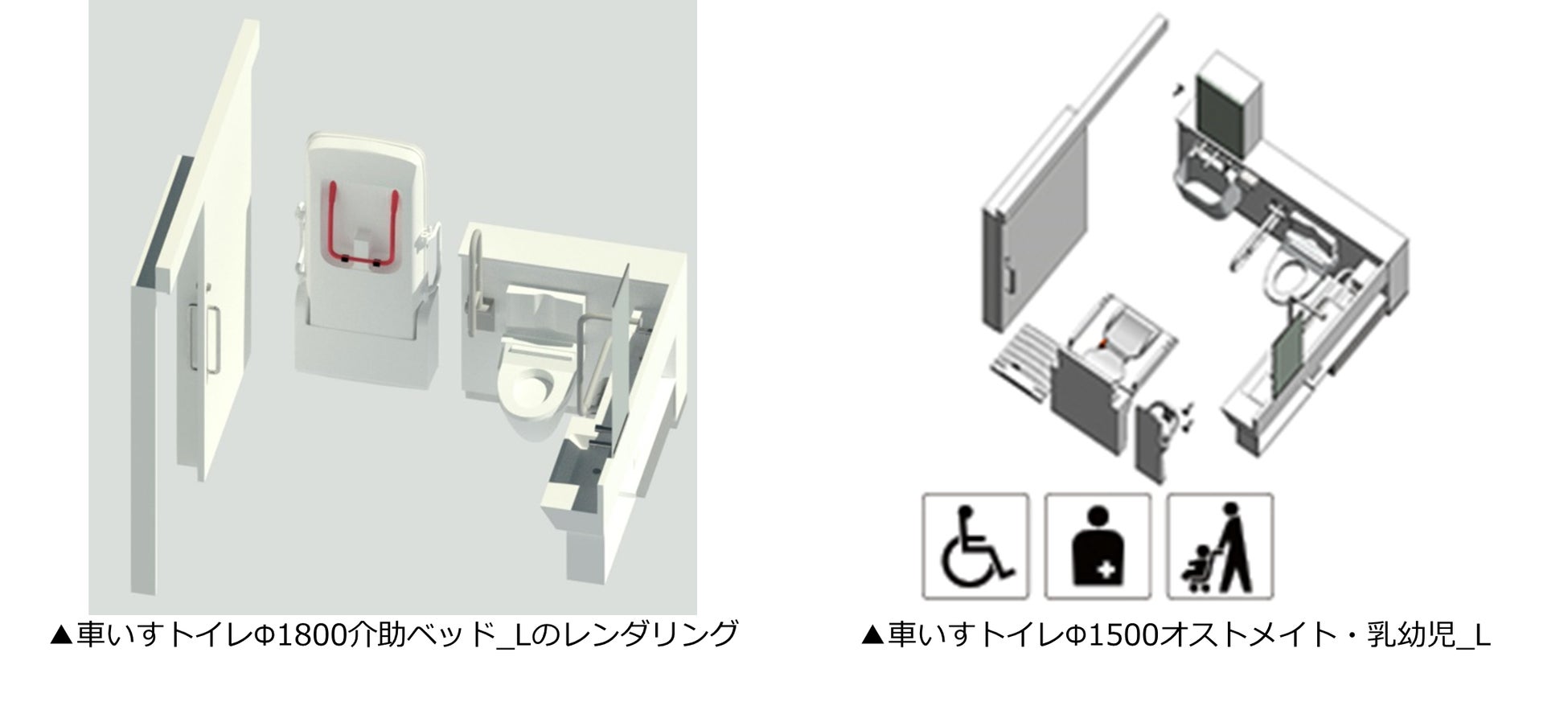 具体的には、トイレブースで構成されていた車いすトイレ空間を建築壁に変更し、コマニー社製のハンギングドア(引き戸)とLIXILのトイレ器具をセットしました。また、建築設計標準に準ずるよう、車いす回転スペースや標準内法寸法2,000mm角を確保した空間設定となっています。床面積2,000㎡以上の特別特定建築物で要求される、車いす回転スペースΦ1,800と介助用ベッド(ユニバ―サルベッド)を設置したデータを2タイプ、車いす回転スペースΦ1,500の車いす使用者トイレと車いす使用者トイレにオストメイト対応設備、乳幼児連れ用設備を組み合わせたデータを4タイプご用意しました。建築物用途の特性や利用者の特性に合わせてトイレ空間設計できるようになっています。