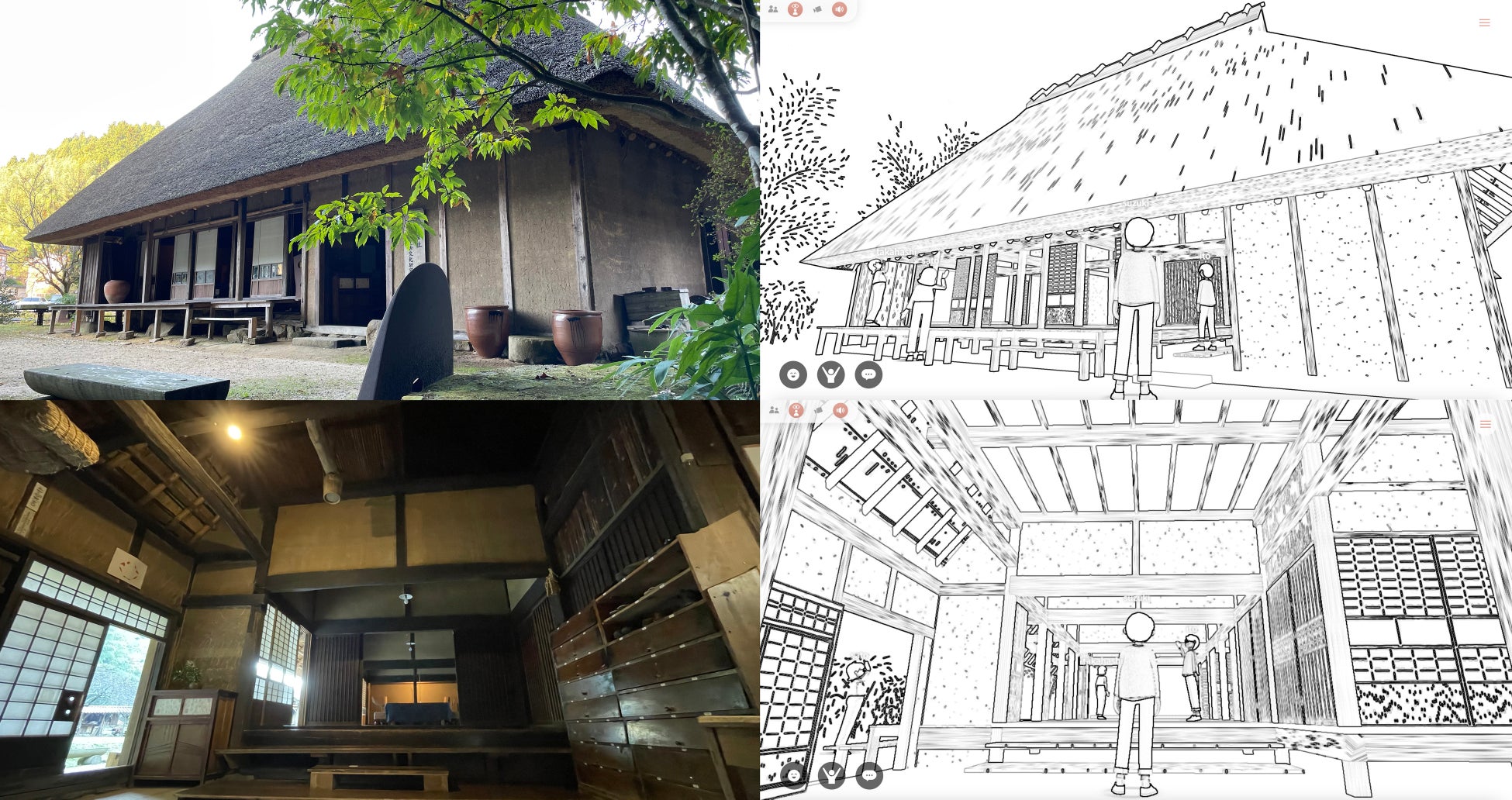手描き風CGでの空間構成は既存のメタバースでは珍しい表現ですが、暖かみのあるタッチでデジタルツイン空間を描くことで、茅葺きの家「鄙舎」や世界遺産「石見銀山」が重ねてきた歴史や文化、その土地の持つ空気感を表現しています。