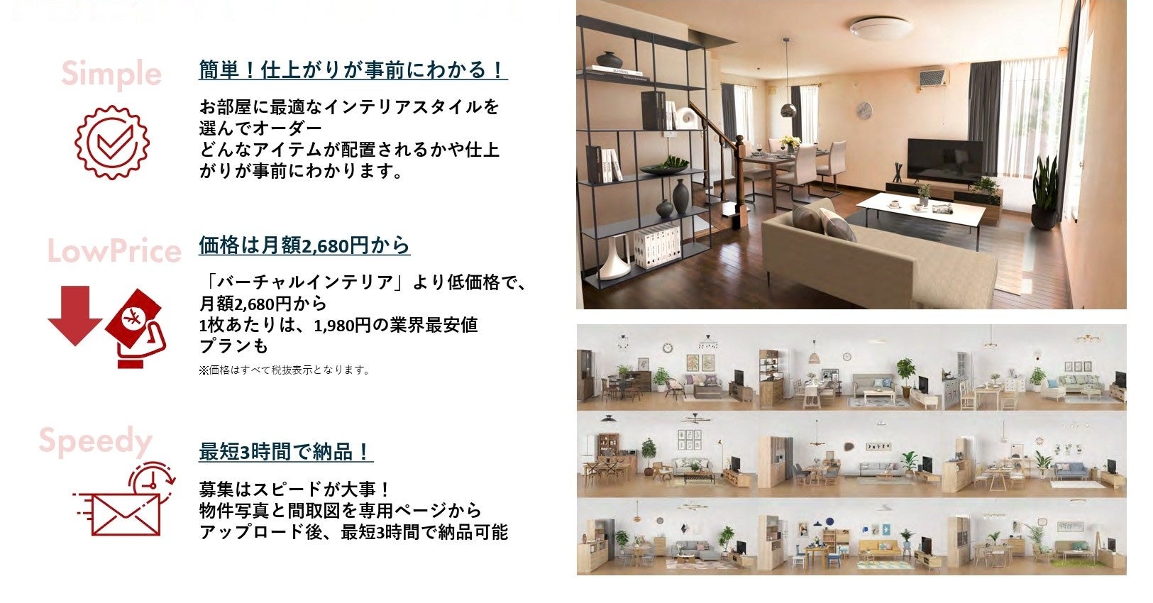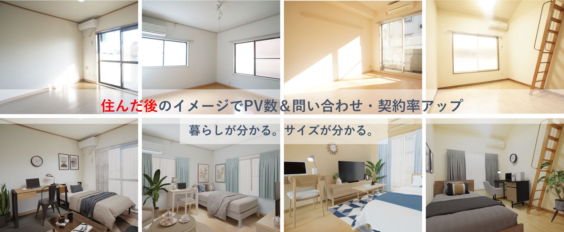 空室や居住中の物件写真・360度パノラマ写真にバーチャル3DCGインテリアをインストールし、 物件の魅力や暮らし方、物件の使い方などをイメージ化するサービスです。物件写真と間取図を送るだけで簡単にオーダーでき、物件広告にお使いいただけます。