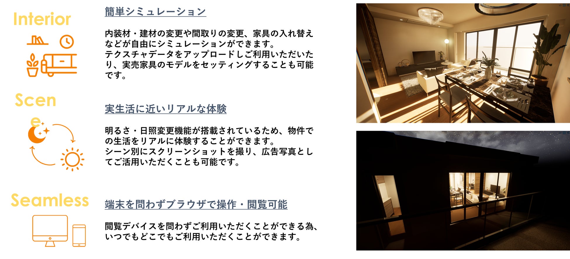 このような背景をうけ、早期契約を低コストで図りたい賃貸仲介の方、新たな集客ツール導入など検討されている不動産会社様に向けて、物件写真に3DCGインテリアをプラスし、暮らしのイメージを伝える広告ツール「バーチャルインテリア」をご紹介する他、ハウスメーカー様や建材メーカー様に向け、3Dでバーチャル空間を作り、物件の内装やインテリアシミュレーションが行えるVRアプリケーション「カラデコ360」をご紹介させていただきます。
