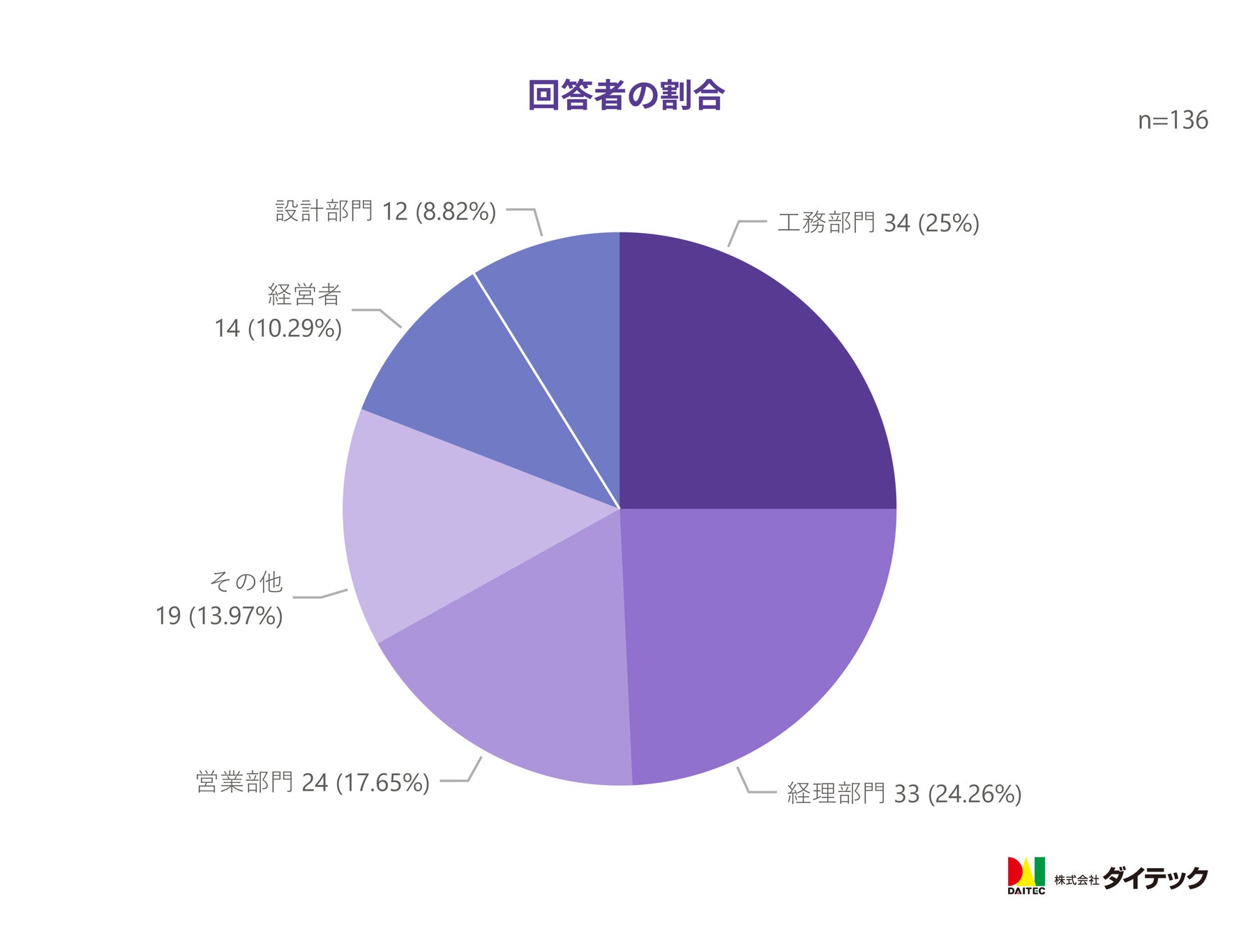- 回答者の割合:経営者10.29%/設計8.82%/工務25%/経理24.26%/営業17.65%/その他13.97%