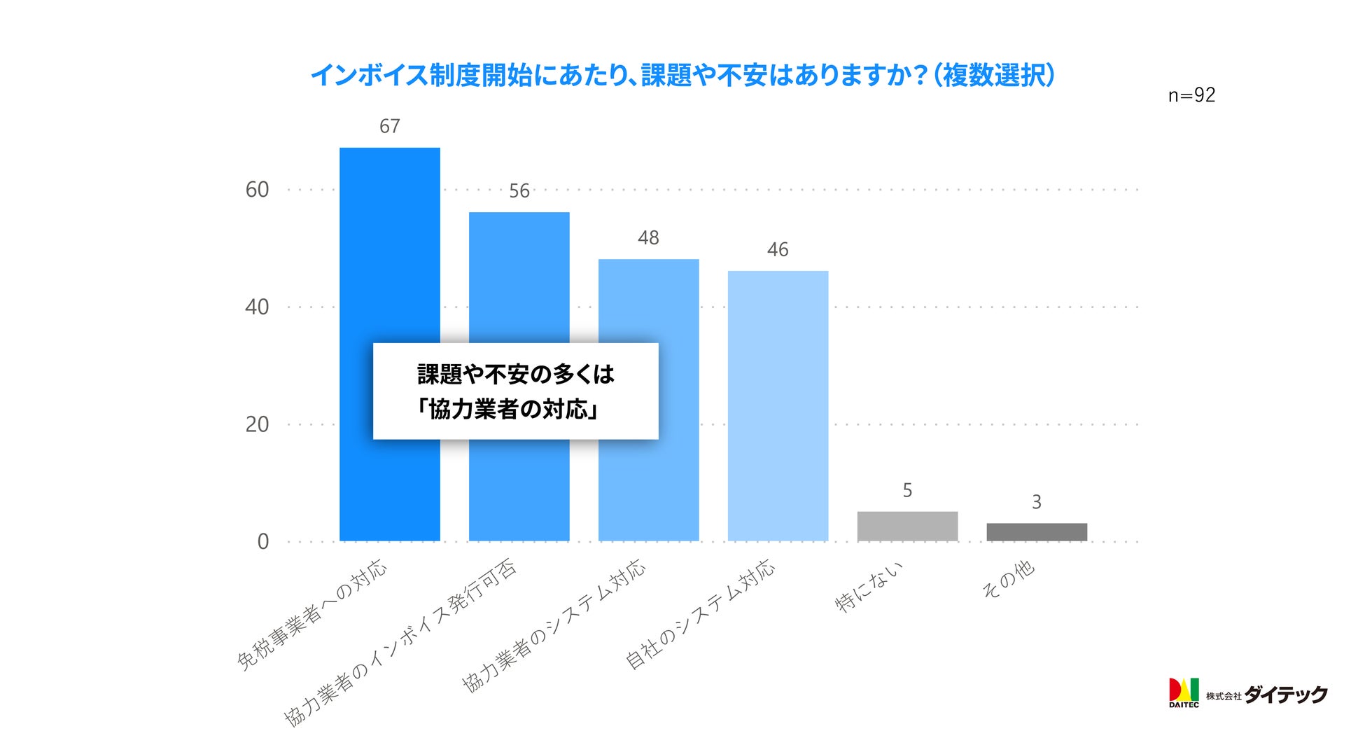 インボイス制度の認知(「知っている」「少し知っている」の合計)は全体の68%にあたる92名で、また、このうち73%にあたる67名が「免税事業者への対応」を不安視していると回答しました。