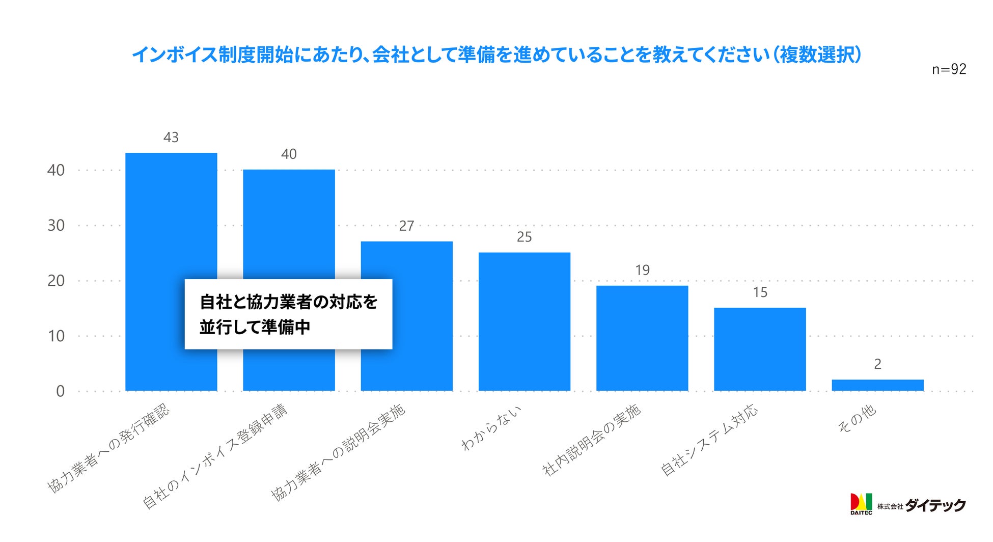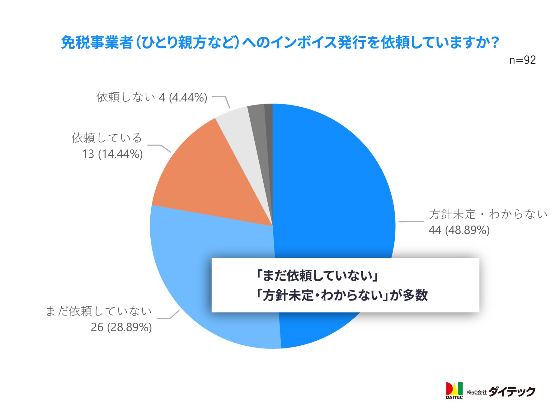 住宅会社のインボイス制度への関心は高く、自社の対応を進める一方で、協力業者の対応(インボイス発行対応、システム対応)を懸念していることが今回の調査でわかりました。特にひとり親方などの免税事業者に対する、インボイス発行依頼の進め方や着地点については方向性を決めかねている傾向があります。