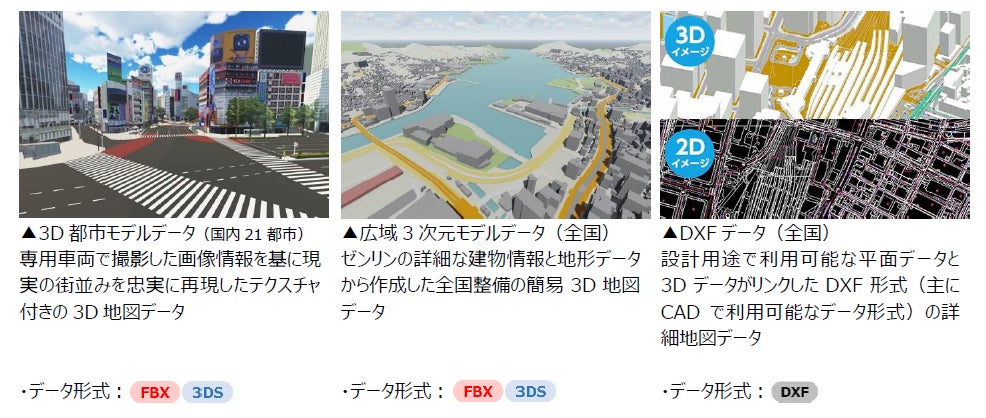 建物の形や階数など、ゼンリンが持つ詳細な地図情報と国土地理院が公開している地形データ、専用車両で計測したデータをそれぞれ組み合わせ、「3D都市モデルデータ」、「広域3次元モデルデータ」「DXFデータ」を整備しています。