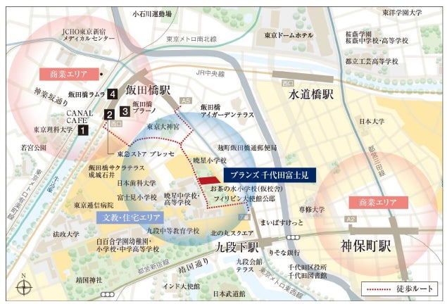本物件は、東京メトロ東西線・半蔵門線、都営新宿線「九段下」駅 まで徒歩5分、東京メトロ東西線「飯田橋」駅まで徒歩6分という利便性が高く、千代田区において希少かつ邸宅地として名高い「富士見」エリアの高台に位置しております。