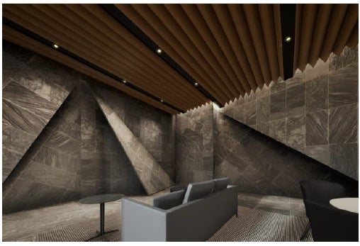外観デザインテーマは、「豊かな緑の中に浮遊する厳かな石のヴェール」。