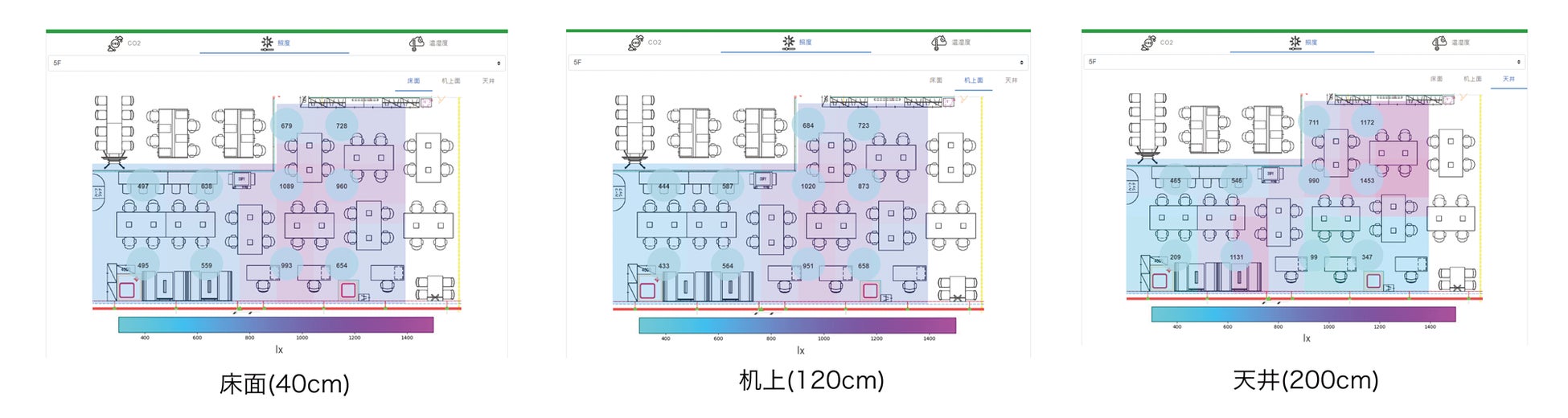 BambooBotを用いた実証実験として、執務スペースの床面・作業机・天井と高さを変えながら、作業場の照度が労働安全衛生規則を満たしているかを確認する法定検査の自動化実験を行いました。その結果、いずれの作業エリアにおいても法定基準を満たしているというレポートを作成することができました。また、部屋の形状によって光の当たりづらくなる領域ができることがわかり、内装の最適化に役立てることもできるようになりました。