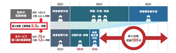 さらに、検査帳票や報告書の作成も自動で生成可能なため、これまで大幅に時間がかかっていた準備や事務作業時間を含め検査時間を約60%短縮することができ、働き方改革にも貢献いたします。