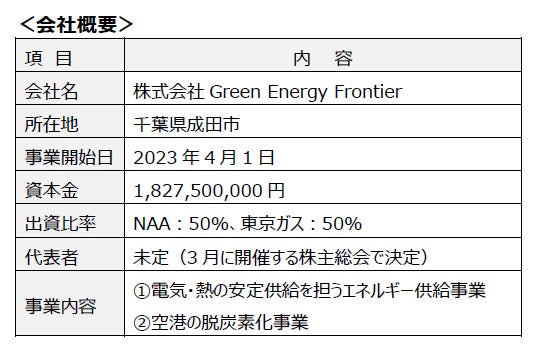 成田国際空港株式会社(社長:田村 明比古、以下「NAA」)と東京ガス株式会社(社長:内田 高史、以下「東京ガス」)は、このたび、成田国際空港にエネルギー供給を行う「株式会社Green Energy Frontier」(以下、「Green Energy Frontier」)を設立し、2023年4月1日より事業を開始します。