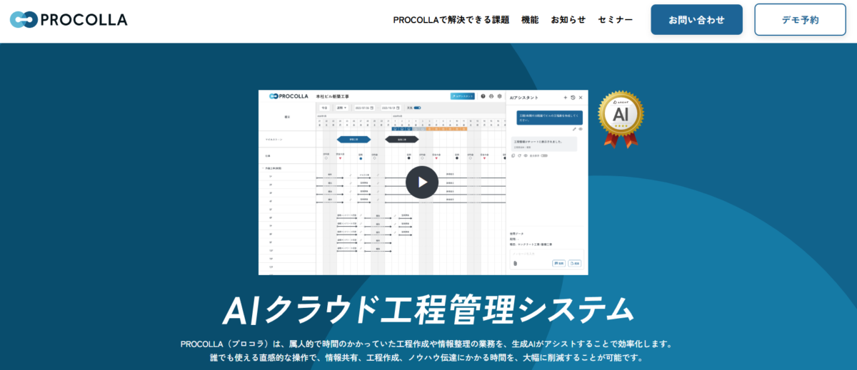 PROCOLLAは、施工現場に関する情報共有や進捗管理をクラウド上で一元化できる「AIクラウド工程管理システム」です。工程情報や関連データをまとめて管理できるほか、AIが工程実績から最適な工程を自動作成する機能も備わっています。