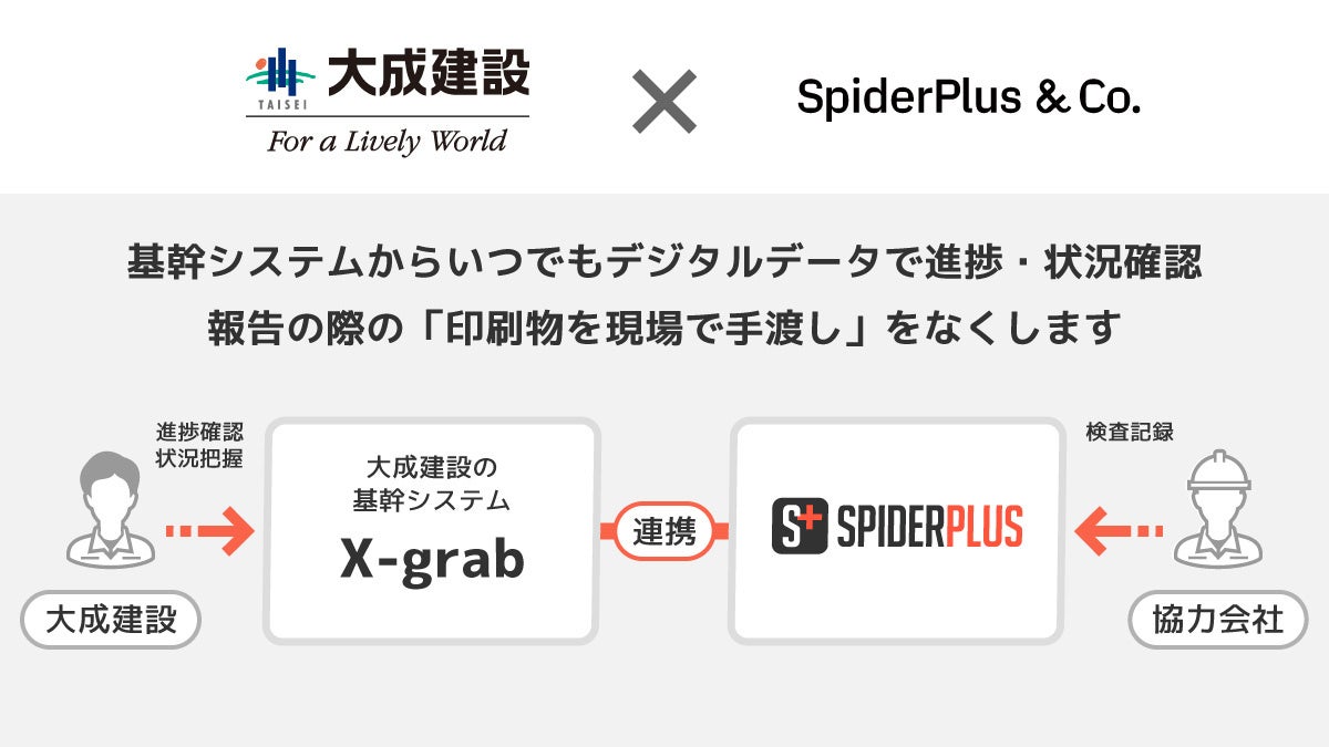 スパイダープラス株式会社(本社:東京都港区、代表取締役社長:伊藤謙自、以下「スパイダープラス」 東証グロース:4192)は、自社で開発・提供する建設DXサービス「SPIDERPLUS(スパイダープラス)」が、大成建設株式会社(本社:東京都新宿区、代表取締役社長:相川善郎、以下「大成建設」 東証プライム:1801)の基幹システム「X-grab(※1)」との連携先として採用されたことを発表いたします。