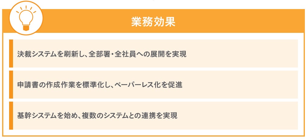 機能やコストを基準に比較検討いただく中、AgileWorksの「拡張性」と「組織や回付ルートの設定しやすさ」を選定の決め手としてご評価いただきました。