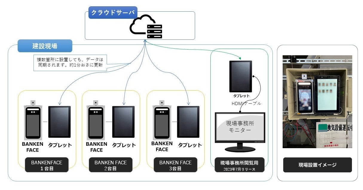 また、タブレット間のデータはクラウドを介して共有する仕組みのため、複数箇所へ設置した場合でも、現場事務所等離れた場所からの把握もできます。さらに、当社サービスの「Buildee」に登録された顔写真等のデータをそのまま活用し、利用開始が可能です。