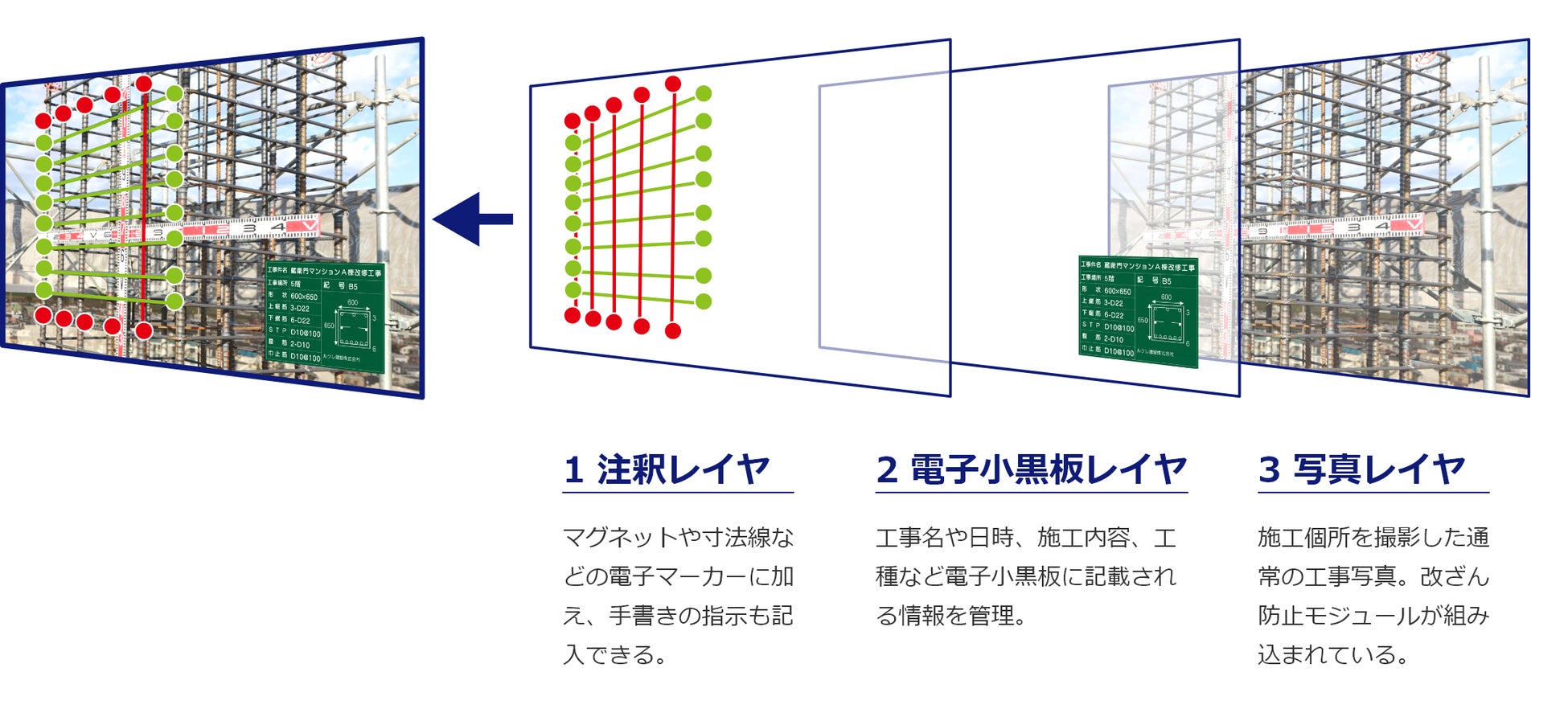 工事写真レイヤ化とは、「写真レイヤ」「黒板レイヤ」「注釈レイヤ」の3つのレイヤで構成された第三世代(工事写真3.0)の工事写真フォーマットです。「写真レイヤ」には従来の工事写真、「黒板レイヤ」には電子小黒板の情報、「注釈レイヤ」にはマグネットや寸法線といった電子マーカーや文字、法線などのテキストあるいは数値を格納。