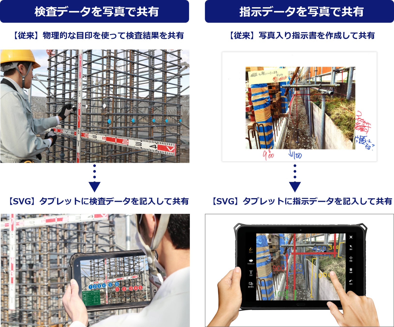 また、SVGで保存された写真には、工事の状況や注意点などを書き込むことができ、クラウドを介して離れた場所にいる関係者へリアルタイムで指示や確認ができるようになります。