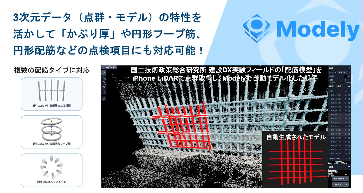 本プロダクトは、iPad等で配筋の点群を計測してクラウドにアップロードすることで、検査対象の配筋モデルを自動生成し、設計値との比較や帳票の自動作成が可能です。これにより、従来の人手による現場実測や帳票作成、現場立会にかかる時間・コストの大幅な削減が実現できます。Modelyは、配筋検査等の効率化を実現する新世代ツールとして、施工現場の課題を解決していきます。
