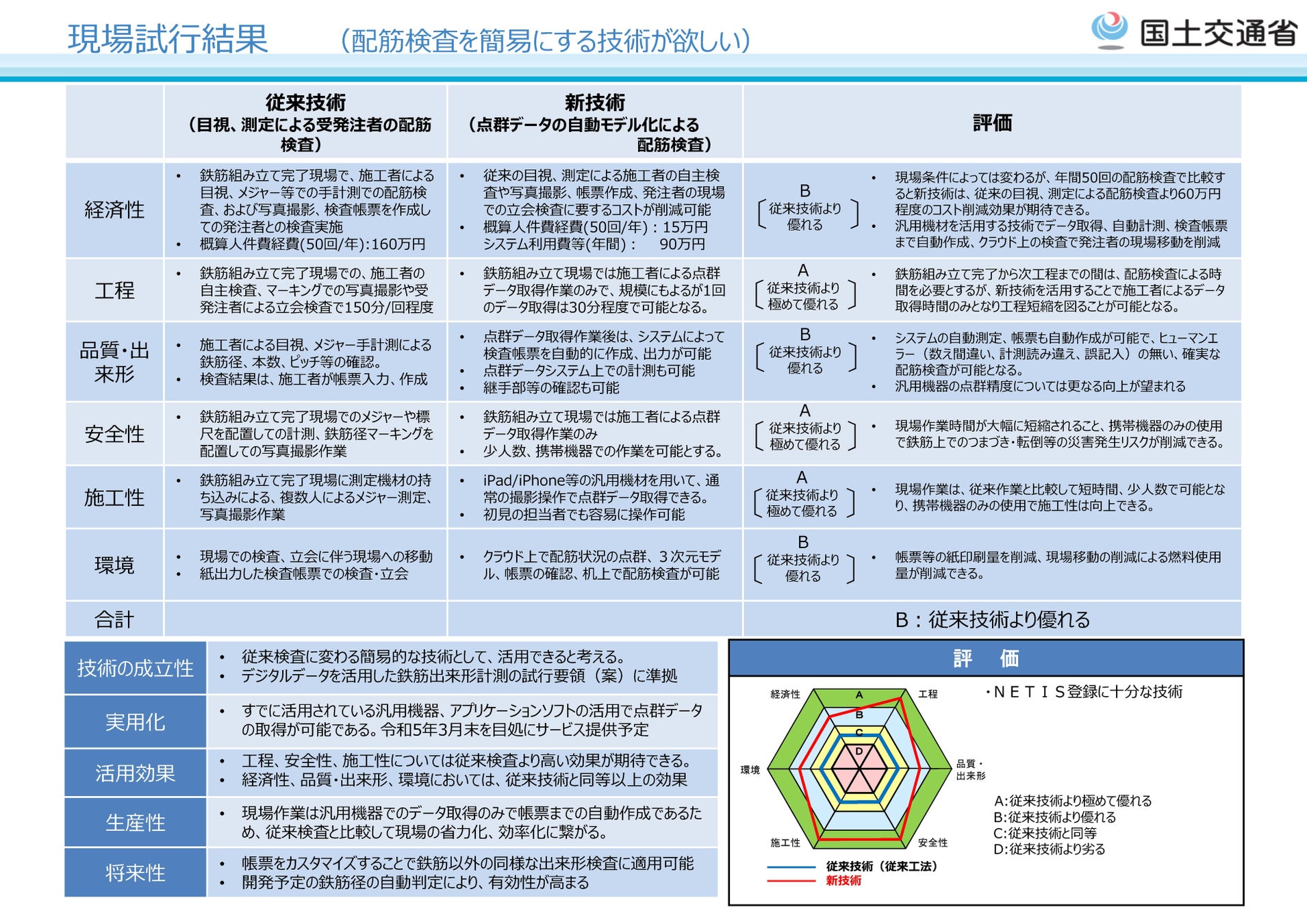 本プロダクトは、国土交通省中部地方整備局との「i-Constructionを推進するための現場ニーズ・技術シーズのマッチング」での現場試行の結果、「工程」「安全性」「施工性」の項目で「従来技術より極めて優れる」としてA評価を獲得。他の項目を含めた全項目でも、「従来技術より優れる」として総合B評価を獲得しました。また、新技術情報提供システム(NETIS)登録に十分な技術であるとの高い評価も得ています。