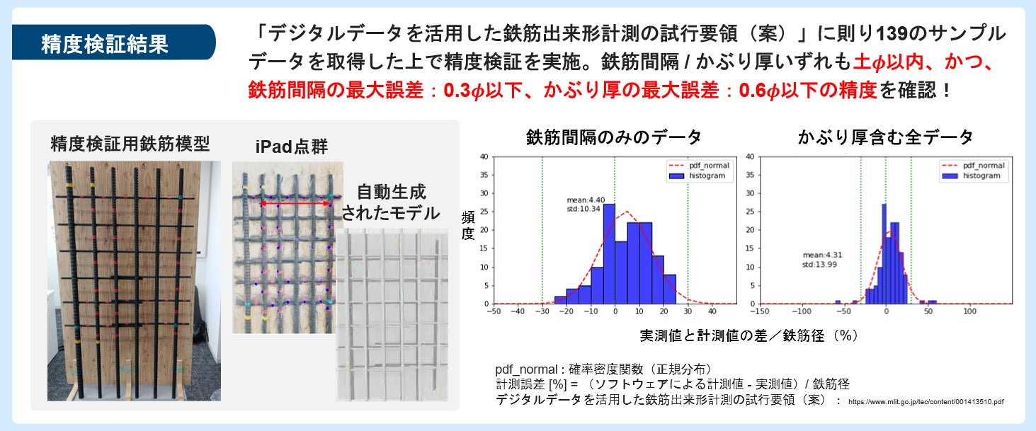 また、3次元データの特性を生かして「かぶり厚」や円形フープ筋、円形配筋などの点検項目にも対応可能です。「デジタルデータを活用した鉄筋出来形計測の試行要領(案)」に則り139のサンプルデータを取得したうえで精度検証を実施したところ、鉄筋間隔/かぶり厚いずれも±100%以内かつ、鉄筋間隔の最大誤差0.3φ以下、かぶり厚の最大誤差0.6φ以下と高い精度が確認されています。