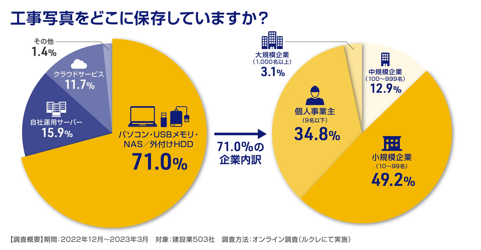 しかし、工事写真の保存先について、ルクレが全国の建設業503社に対してオンラインで調査を行ったところ、作業をするパソコン(内蔵HDD)、USBメモリやNAS(Network Attached Storage)を含む外付けHDDなどの物理的な保存場所が約7割を占めるという結果が出ました。この傾向は企業の規模に関係なく、個人経営の零細企業から大手ゼネコンまで広く見られました。