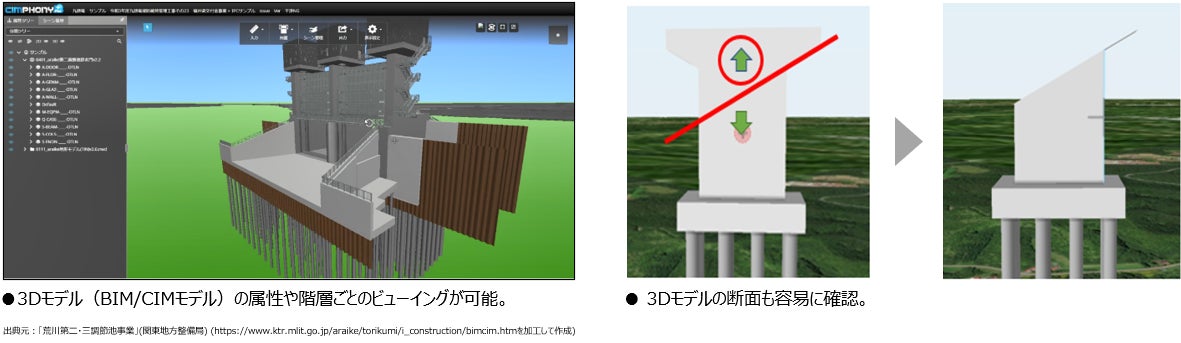 今回のアップデートでは、ベントレー・システムズ社のiTwinプラットフォームを活用した3Dモデルビューアを搭載し、WEBブラウザ上で属性や階層が付与された3Dモデル(BIM/CIMモデル)を詳細かつ手軽に扱うことができるようになりました。