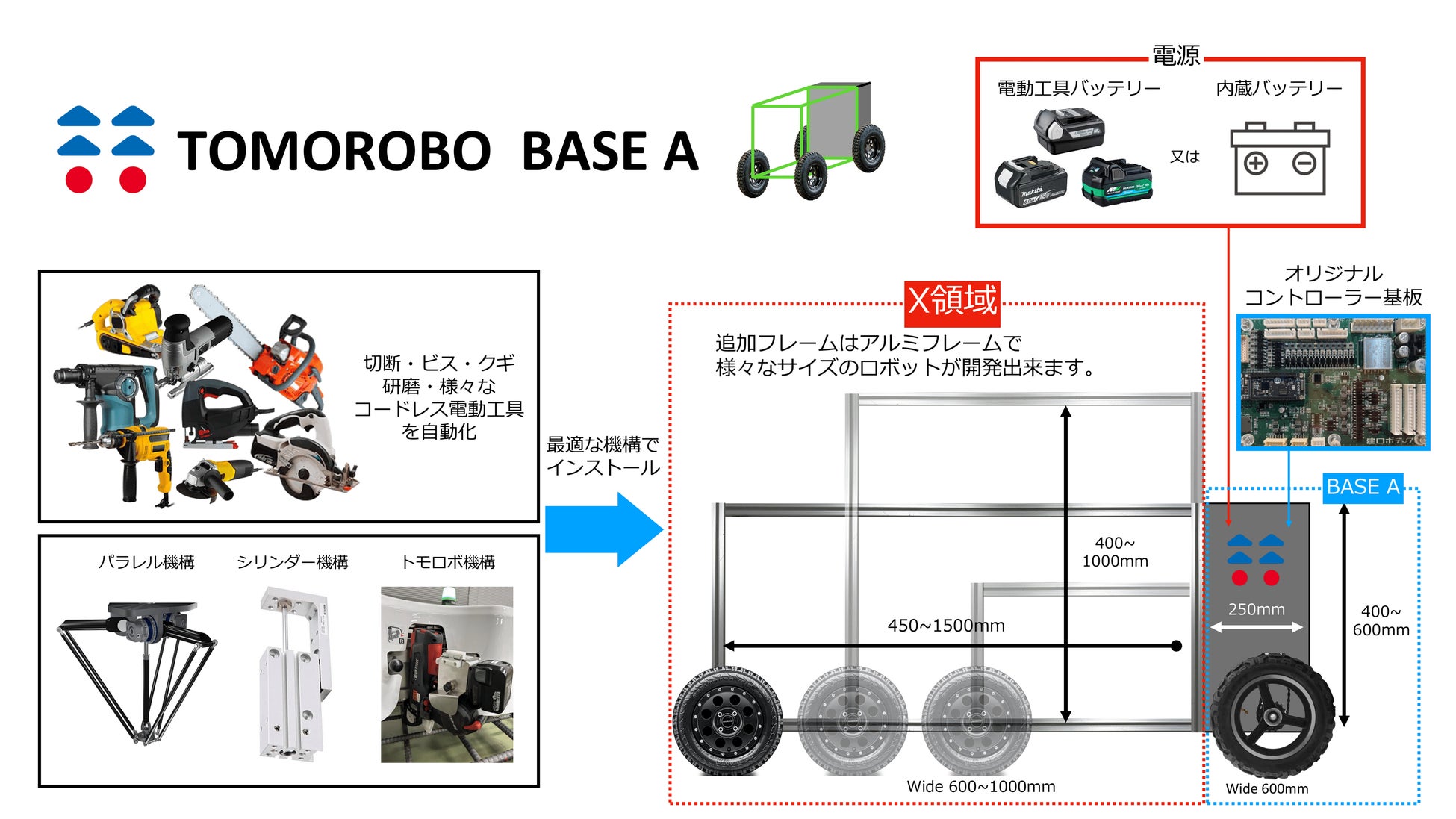 「TOMOROBO BASE A」は、建設ロボットのベースとなる電源や制御基板を搭載した電動駆動ユニット“BASE A”と、ユーザーの要望によって最適な機構をインストール&カスタマイズ可能な作業領域“X領域”で構成された、短期間で建設ロボットを提供する新しい開発サービスです。