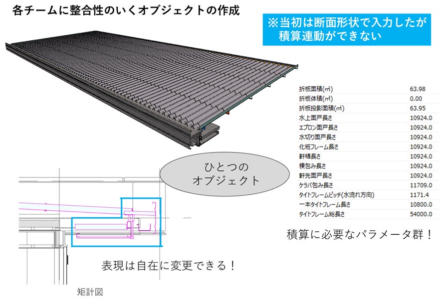 この作成されたオブジェクトは、設計者が図面を作成すれば積算用に必要な部材がアドオンを使用することにより自動発生する仕組みになっています。