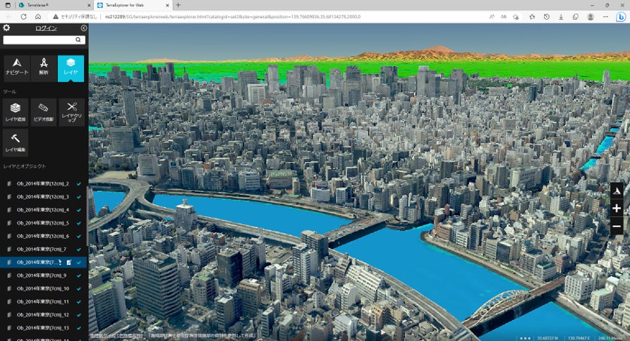 「TerraVerse」から配信されるデータは、Skyline社製3次元ビジュアライゼーションソフトウェアである「TerraExplorer」シリーズをはじめ、ESRI社製GIS、オープンソースGISのQGIS、セシウムベースのソフトウェアなどで利用可能です。なお、「TerraExplorer」シリーズで利用いただく場合、インターネット上で公開されているオープンデータも読込み、重畳することも可能です。
