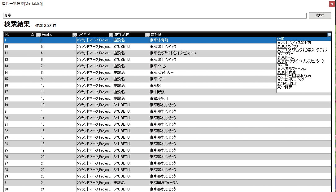 データの属性値に含まれる情報を、レイヤーを跨いで一括検索することができます。