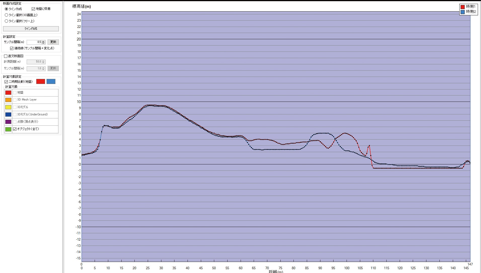 任意の複数地点をクリックすることで地点間の断面図を作成することができます。