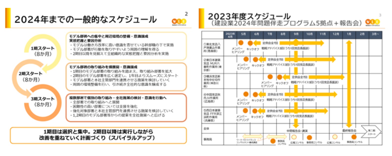 こうした反応を受け、2024年4月までに時間外労働上限規制の遵守と全作業所の4週8休を実現する体制を構築するという目標を達成するためには、より高度な専門家の支援を受けることが必要とのことで、2023年2月から2か月間、水門の移築工事を行う東京支店新砂水門作業所にて先行試行を実施、社内会議時間を半分にするべく、朝礼・夕礼の効率化に取り組んだところ、「発言が活発にでるようになった」「自発的に行動するようになった」といった一定の変化が見られたため、2023年5月より、東北支店、東日本建築支店、横浜支店、西日本建築支店、中国支店の計5カ所に、「建設業2024年問題働き方改革伴走プログラム」を導入することとなりました。