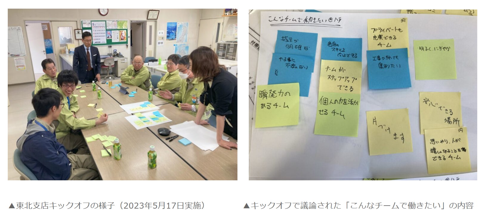 2023年5月17日に実施した東北支店にて取り組みを開始するキックオフには、管理職・従業員など6名が参加、働き方改革の必要性についてディスカッションや、自分たちが目指す取り組み目標を計画しました。今後、同キックオフを他の4支店で展開し、それぞれの課題にあわせた解決策を検討・実施していきます。