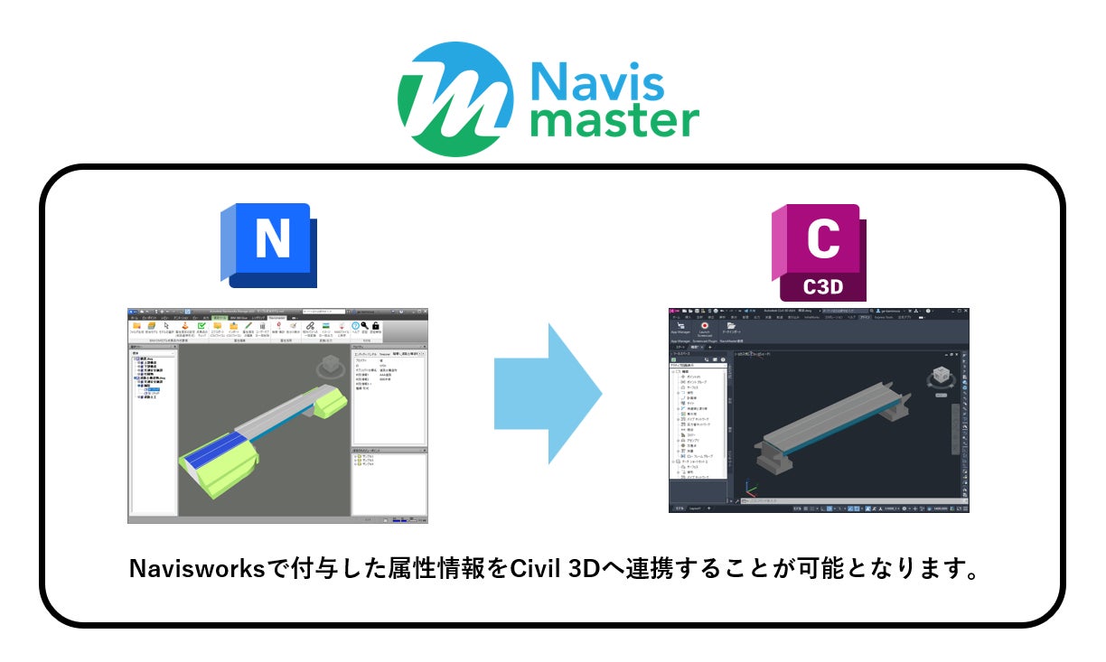 今回のバージョンアップでは、Navisworks上で付与した属性情報※2をAutodesk Civil 3D®︎※3(以下Civil 3D)に連携する「Civil 3D連携」機能を追加しました。この機能によりNavisworks上の統合モデル※4に付与した属性情報をCivil 3Dへ引き渡すことが可能となり、さらにCivil 3DのIFC※5出力機能を使うことによってIFCファイル書き出しまでをサポートできるようになりました。