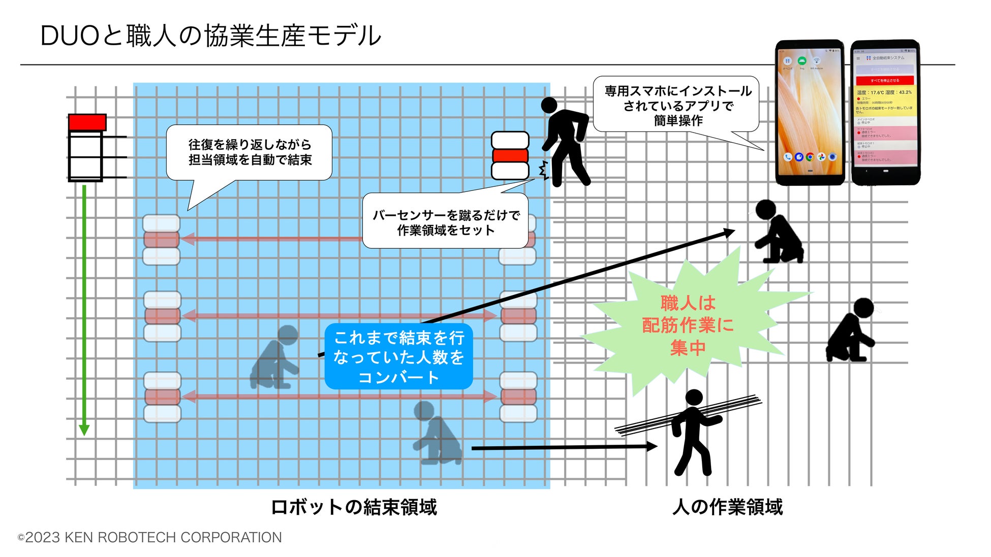 人がレーンチェンジに介在することがないので、ロボットから目を離して他の作業を行うことが可能です。例えば、広い現場であれば配筋ができている箇所から結束作業をDUOで行い、職人は残りの配筋作業に注力することができます。