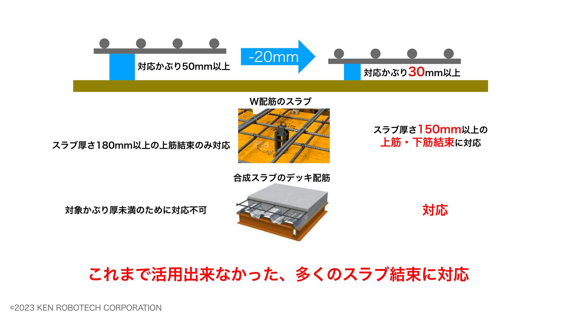 また、これまで対応できなかった合成スラブのデッキ配筋でも対応が可能となり、これまで利用できなかった様々なスラブ結束に対応しています。