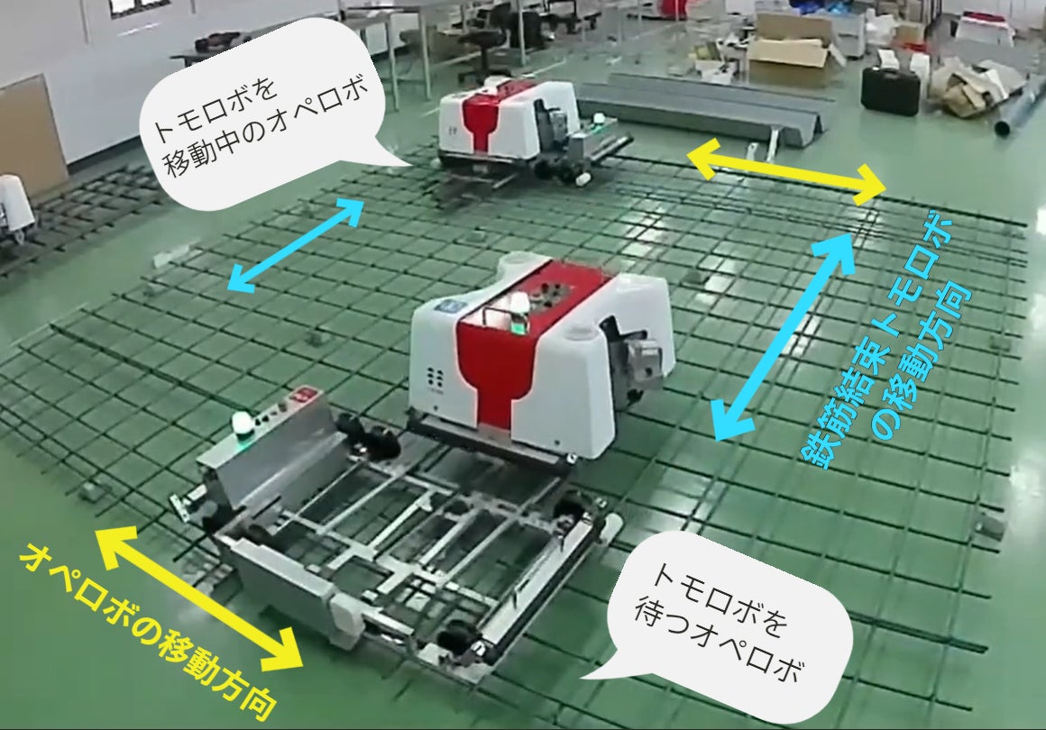 鉄筋結束トモロボとオペロボを通信連携することで、2つのロボットが自動で連携しオペロボはトモロボが来るレーンの列に移動してトモロボが来るまで待機し、トモロボが到着すると次のレーンチェンジをするというこの繰り返しの作業を自動で行います。