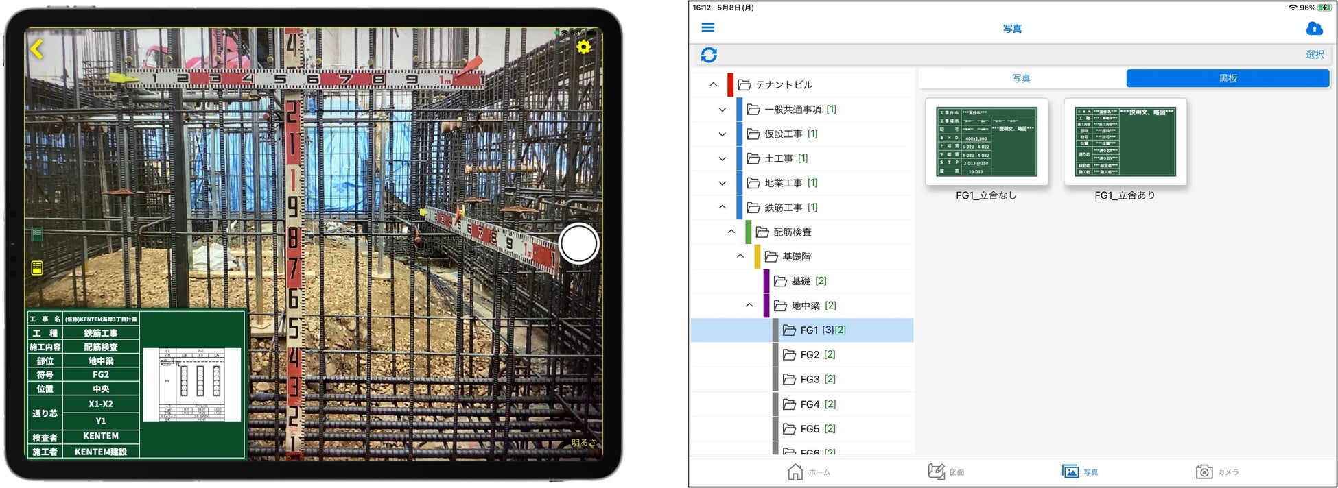 現場に行く前に撮影したい箇所の黒板を作成して撮影することで、自動的に同じフォルダーに写真が保存され、整理もかんたんに行えます。