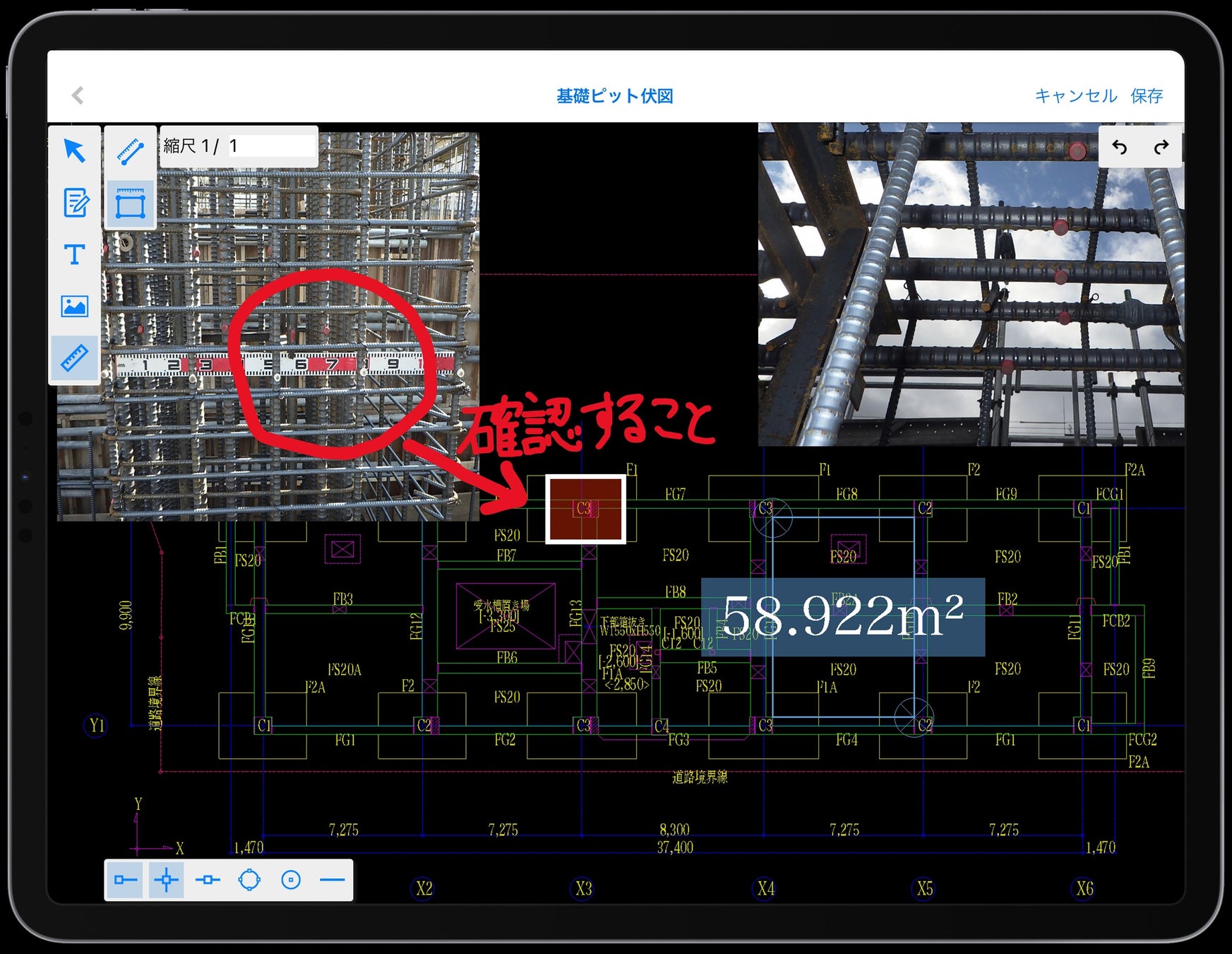CAD図面計測機能を搭載し、現場でも正確に図面の計測が行えます。また、メモ書きしてクラウドで共有することで現場の状況をかんたんに素早く周知できます。