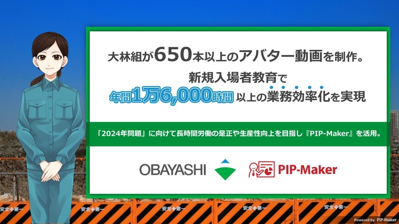 大林組では、「PIP-Maker」で制作した650本以上のアバター付き動画を毎朝行われる各現場毎の新規入場者教育に活用することで、いくつかの現場事務所では、新規入場者教育の時間が2分の1以下になっており、全体では年で約1万6,000時間以上の業務効率化を実現しています。