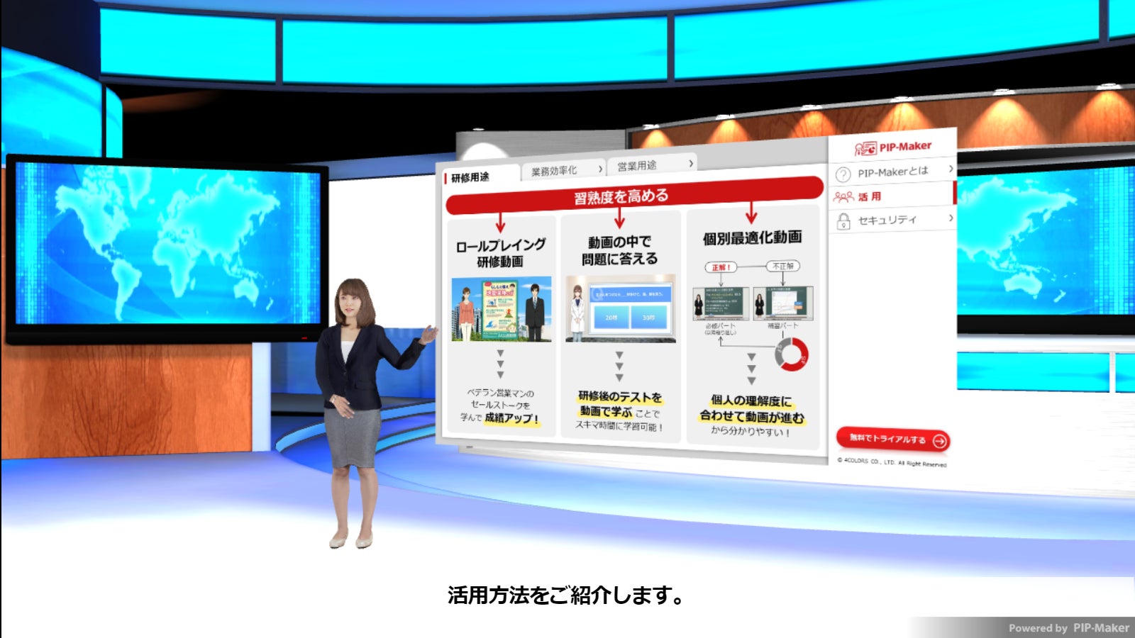 「PIP-Maker」は、パワーポイントから最短5分でアバター・音声付きeラーニング動画を制作でき、習熟度アップ、作業時間の短縮、コスト削減が簡単に実現可能な月額クラウドサービスです。