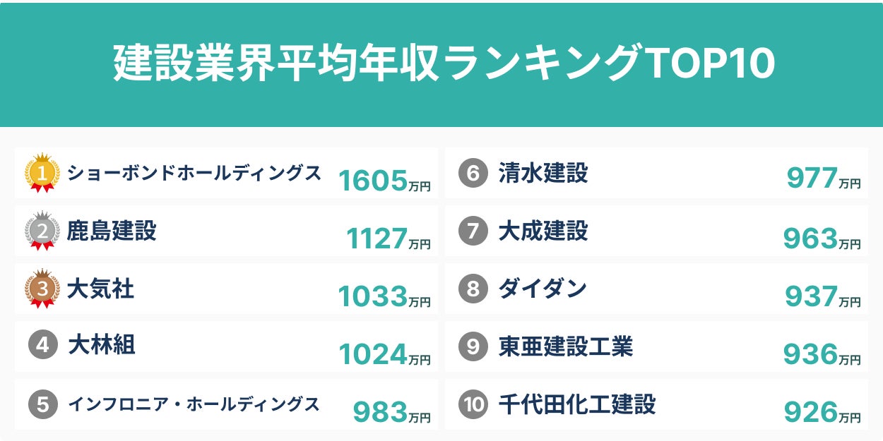 業界の高収入企業と注目のトレンドを紹介。建設業界平均年収ランキングTOP10を発表!/SalesNow DBレポート