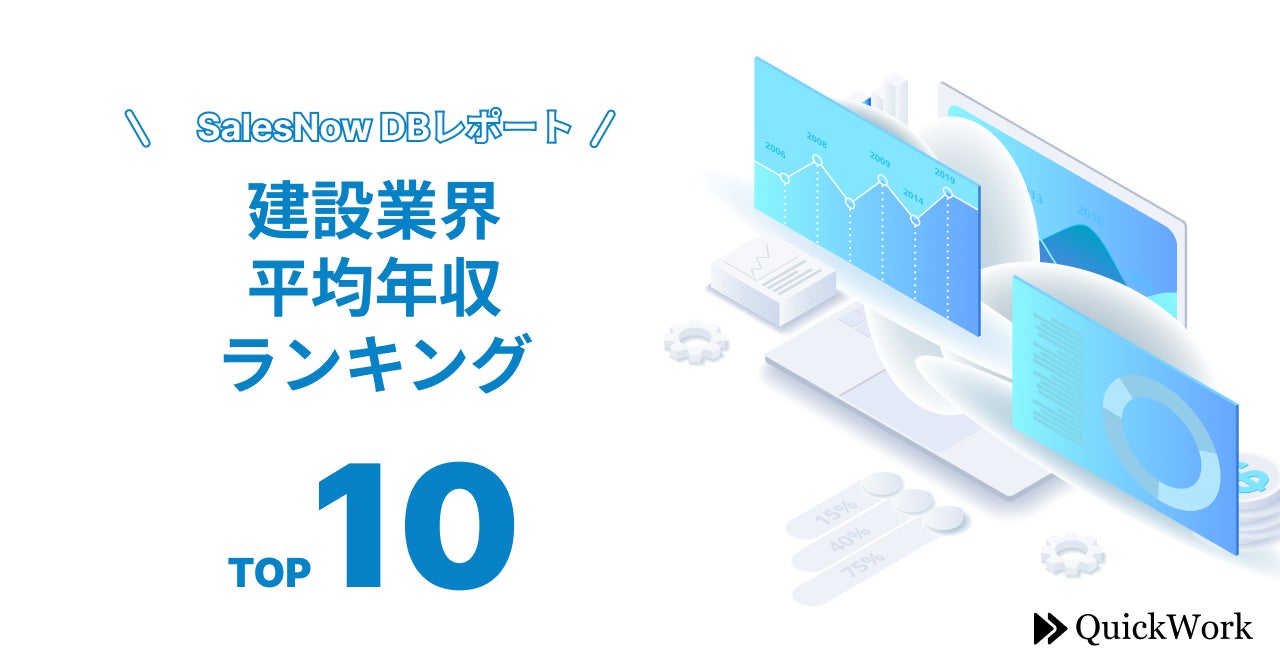 「データとテクノロジーで、働き方を変革する。」をミッションに掲げ、日本全国500万社以上の企業データを基盤に営業の効率化を支援する「SalesNow」を展開してきた株式会社QuickWork(本社:東京都渋谷区、代表取締役:村岡功規、以下「QuickWork」)は、日本全国500万社以上の企業情報を網羅した日本最大級のデータベースを誇る「SalesNow DB」において、建設業界における平均年収ランキングTOP10を抽出したのでお知らせします。