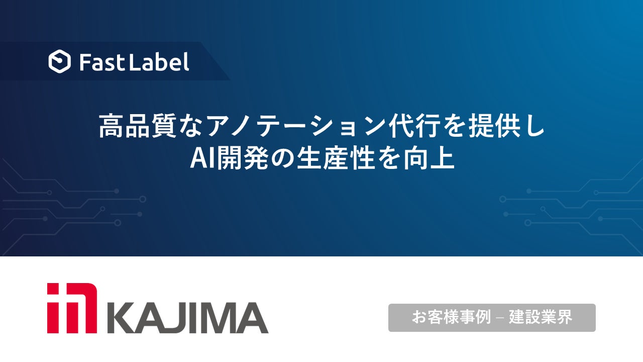 AI開発の各プロセスを包括的にサポートする「AIPaaS」(※)を提供するFastLabel株式会社(本社:東京都品川区、代表取締役CEO:上田英介、以下「当社」)は、建設業界のリーディングカンパニーとして、土木・建築・開発事業などを手掛ける鹿島建設株式会社(本社:東京都港区、代表取締役社長:天野裕正、以下「鹿島建設」)に高品質かつ低コストのアノテーション代行によるデータセットを提供し、AI開発の生産性向上に貢献したことをお知らせします。