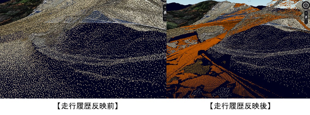 また、本サービスと「Smart Construction Dashboard」※2を連携することで、ブルドーザーなどの建設機械や自動車などあらゆる車両の走行履歴情報を点群データとして表示できるため、日々の施工状況や出来形など現場の進捗状況を容易に確認、共有することが可能になります。