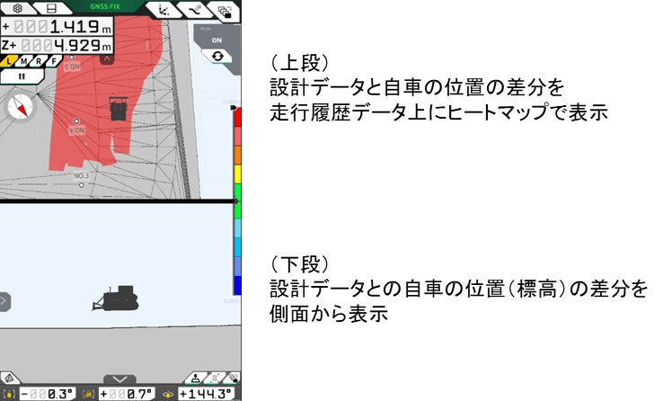 運転席に「Smart Construction Pilot Flex」アプリをインストールしたタブレット画面を設置することで、丁張のないICT施工現場でも3D設計データと自車(接地面)の位置や走行履歴データを確認しながら施工が可能。設計データと自車の位置の差分を走行履歴データ上にヒートマップで表示。