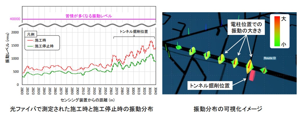 そのような課題に対応するため3社は、NTT東日本の通信用光ファイバ、ならびにNECと鹿島の光ファイバセンシング技術を用いて、トンネル掘削工事に起因する振動を計測することで、工事振動の影響範囲を常時かつ面的に可視化する実証実験を行いました。