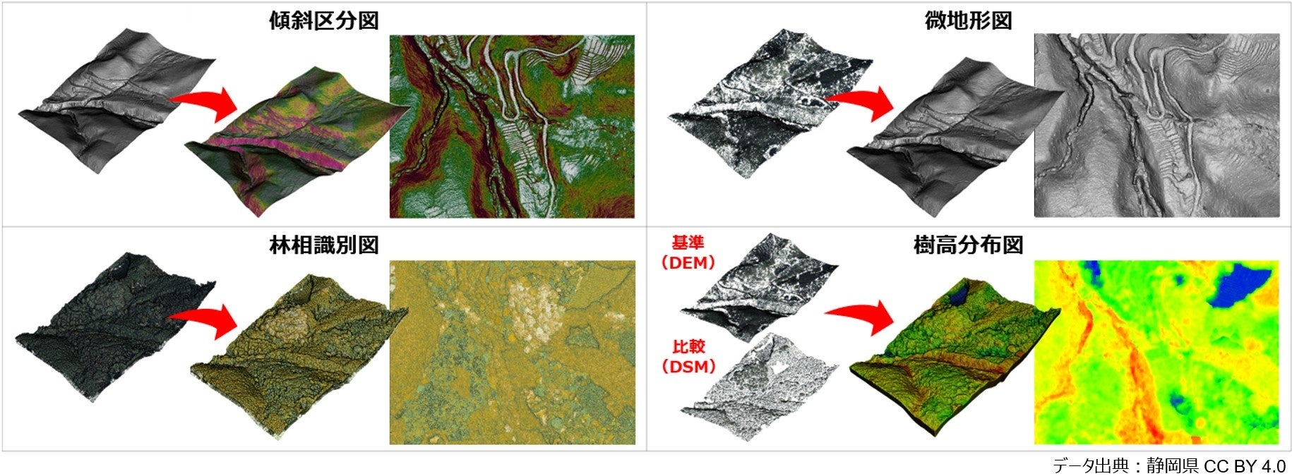 傾斜区分図の作成により、土砂崩落や雪崩といった災害危険箇所の抽出が可能。林道計画やハザードマップの作成などに活用することができます。