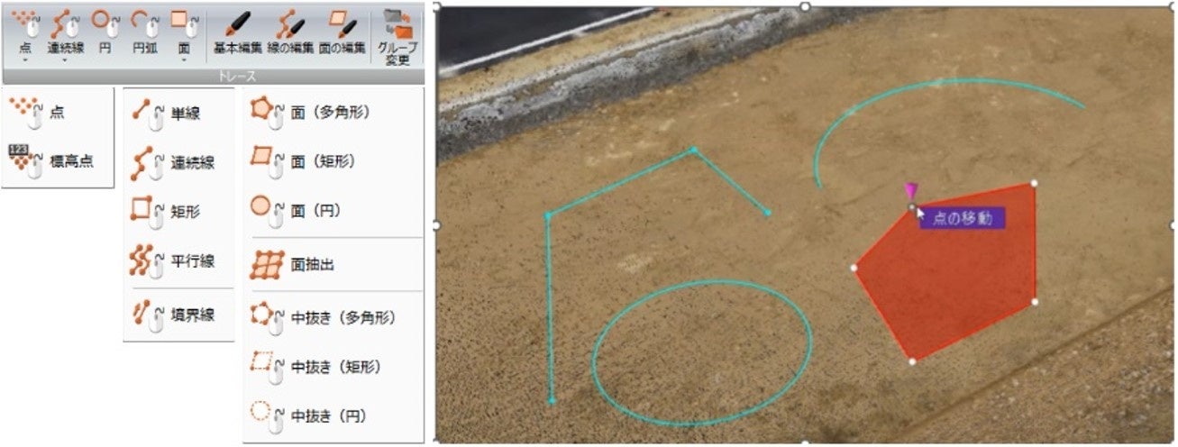 平行線や多角形、円弧や閉合図形の中抜きなど、トレース作業を効率化する様々な作図機能の追加と、トレース線の編集機能を拡充しました。簡易断面におけるトレースにも利用できます。